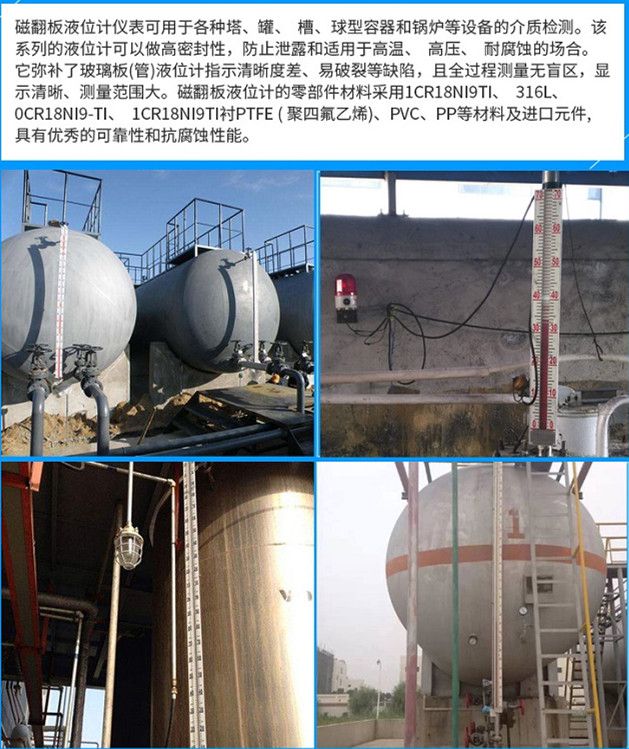 磁翻板液位計廣泛用于石油、化工、油田、醫(yī)藥、食品、酒業(yè)等行業(yè)中各類貯液罐、貯槽、貯液池、反應(yīng)罐、發(fā)酵罐內(nèi)液體、油田、液化氣、液氫、強(qiáng)酸堿液、弱酸堿液、發(fā)電廠鍋爐汽包、高低加、回水箱高低壓加熱器、凝結(jié)器、蒸發(fā)患有主其他壓力容器內(nèi)與1Cr8NitTi、304+PTEE(聚四氟乙烯)、316L、PVC、PP相容液體介質(zhì)的液位、液面及兩種不同介質(zhì)界面測量與顯示。
