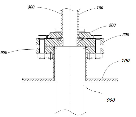 針對傳統(tǒng)頂裝式軟化水液位計的這些弊端,在多次試驗的基礎(chǔ)上,對現(xiàn)有的內(nèi)襯工藝與結(jié)構(gòu)做了改進,發(fā)明了頂裝式軟化水液位計的一種新工藝及其結(jié)構(gòu),如下圖所示,其提供了*一連接件和連接內(nèi)襯。該連接內(nèi)襯具有用于連通內(nèi)襯連接口的*一連接口、自*一連接口向外成環(huán)形設(shè)置的*一密封部、用于與被測容器連通的*二連接口和自*二連接口向外成環(huán)形設(shè)置的*二密封部。由于該*一連接件和連接內(nèi)襯為單獨設(shè)置,可以單獨制造,因此*一密封部和*二密封部可以制作的足夠大,從而實現(xiàn)*一密封部與浮筒內(nèi)襯的翻折部密封抵接;同時,連接內(nèi)襯的*二密封部用于與容器實現(xiàn)密封連接。由此,該連接內(nèi)襯可以與浮筒內(nèi)襯和容器開口內(nèi)的護筒形成完全密封的連接,從而避免連接處的金屬面受腐蝕,使生產(chǎn)安全順利地進行,免受因發(fā)生生產(chǎn)安全事故對生命和財產(chǎn)造成的安全威脅。