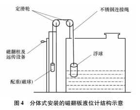 ①通過計算浮力和配重,在槽體頂部合適位置安裝定滑輪,在槽外合適位子安裝磁翻板傳感裝置;