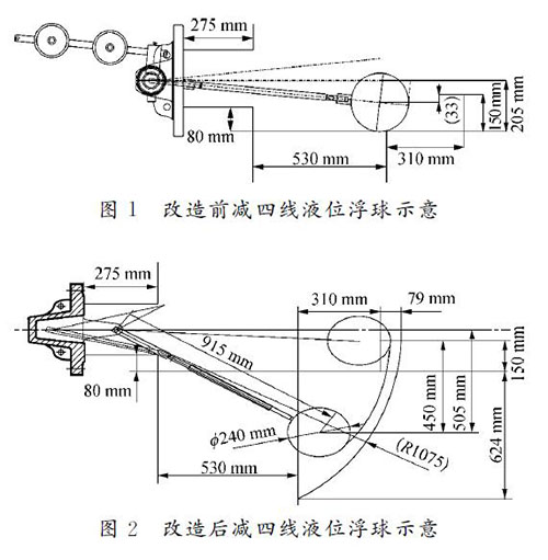 針對(duì)減四線液位測(cè)量進(jìn)行大轉(zhuǎn)角、切割集油箱改造,有效量程大于設(shè)計(jì)量程的80%,其改造測(cè)繪圖如圖2所示。改造后,安裝支架120 mm,插入深度為1?。保担担恚?,實(shí)際測(cè)量液位達(dá)450mm,儀表接液部位全部選用317材質(zhì)。轉(zhuǎn)軸—杠桿套筒、杠桿套筒—連桿、浮球—連桿的固定連接節(jié)點(diǎn)及加工焊接坡口增加焊接強(qiáng)度;對(duì)于活動(dòng)節(jié)點(diǎn),采用專用銷子固定。
