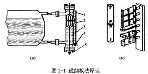 磁翻板液位計帶遠傳原理如圖1—1a所示,1-翻板指示組件;2-浮子;3-連通管組件;4-調(diào)整螺釘;5-放泄塞。浮子裝有一組永久磁鐵,隨液位變化而上下移動,通過磁耦合作用帶動磁翻板組件翻轉(zhuǎn)。當液位上升時,磁翻板的紅色面朝外;液位下降時,白色面朝外。故根據(jù)磁翻板的顏色即可確定液位。浮子內(nèi)磁鐵與磁翻板磁性結(jié)構(gòu)如圖1—1b所示,每片翻板間的距離一般為10 mm。采用幾臺磁翻板裝置串聯(lián)可增大量程。