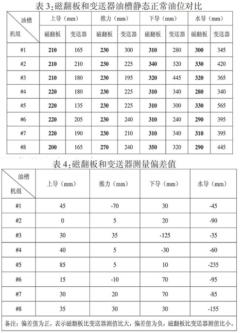3)通過表3、表4,可以看出磁翻板耐酸堿磁翻板液位計廠家油位和變送器油位測值存在偏差,導致變送器油位測值不能直接反映油槽實際油位的高低,需要結(jié)合磁翻板和變送器的偏差值才能得出油槽實際油位,故建議下個檢修期時重新修正油位變送器的量程,使靜態(tài)下變送器油位測值與磁翻板油位保持一致,運行時能夠直接反映油槽實際油位的高低;