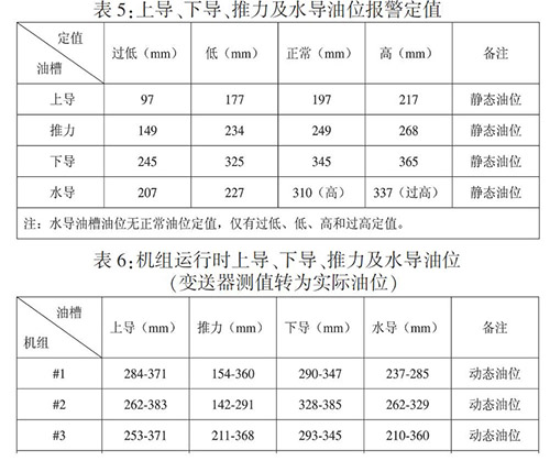 未給出實際運行中動態(tài)油位報警定值,磁開關(guān)安裝位置也是按照表5來調(diào)整的,機組運行時油槽內(nèi)實際油位(表6,變送器測值加上表4偏差值)波動大,各部動態(tài)油位已超過磁開關(guān)定值,故CCS會頻繁報警。