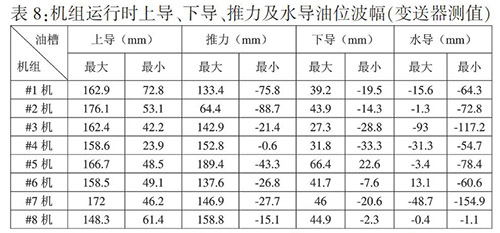 從表8可以看出,上導波幅均在靜態(tài)油位以上,容易出現(xiàn)高油位報警;推力和下導油槽油槽波幅均上下跨越靜態(tài)油位,容易出現(xiàn)高油位、低油位報警;水導油槽波幅在靜態(tài)油位以下,容易出現(xiàn)低油位報警。
