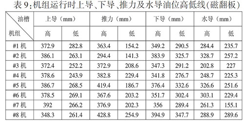 表9中數(shù)據(jù)可以作為目前油位高低報警的參考線,但是由于目前汛期不具備條件消缺,等到2015~2016年度檢修期間,可以參考該數(shù)據(jù)和二灘、官地電廠定值對油位高低報警線進行調(diào)整,磁開關(guān)根據(jù)表9進行調(diào)整。