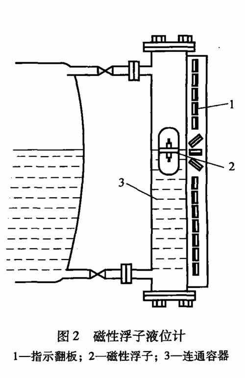 硝酸銨溶液生產(chǎn)企業(yè)里多數(shù)使用磁性浮子防爆型磁翻板液位計(jì),防爆型磁翻板液位計(jì)根據(jù)浮力原理和磁性耦合作用研制而成,如圖2所示。