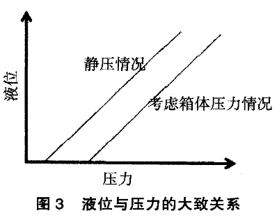 針對設(shè)備的故障,技術(shù)人員采取了更換多種質(zhì)量好的磁感應開關(guān)(如耐高溫型等),以及基于磁翻板的外貼式模擬量液位控制,但效果均不理想。其他液位測量(如超聲波等)造價較高,而且需要對設(shè)備進行相應的改造,并且停運一段時間,而該系統(tǒng)屬于公用,上述條件均無法滿足。既要實現(xiàn)自動控制,又要相應允許實施。技術(shù)人員再次結(jié)合系統(tǒng)圖進行了分析:該水位溢流處和下限處范圍還是比較寬裕,而且箱體為非承壓容器,所以箱體內(nèi)的壓力和大氣壓相差不大,即便是有也基本上保持恒定,結(jié)合原水位測量的結(jié)構(gòu),考慮在海水液位計的液位測量筒下部加裝1臺壓力變送器,在箱體壓力不是很大且基本恒定的情況下,液位與壓力值基本成對應關(guān)系(只是在現(xiàn)場修正疊加一個常數(shù)值來消除箱體上不恒壓所帶來的偏差)。液位與壓力的關(guān)系曲線見圖3。