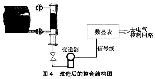 在外配1塊可輸出開關(guān)量接點的模擬量顯示儀表,這樣可實現(xiàn)液位的自動控制,集體的偏差多少可以在就實際進行整定試驗。整套測量系統(tǒng)的結(jié)構(gòu)圖見圖4。