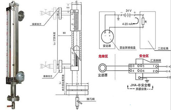 液體液位計是以浮子內(nèi)磁鋼驅(qū)動雙色薄片的翻轉(zhuǎn)來指示液位的一種新型儀表,主體不銹鋼內(nèi)腔管中磁浮子隨液位的升降而上下運動,同時驅(qū)使主體外指示器內(nèi)的雙色薄片翻轉(zhuǎn),有液位時轉(zhuǎn)示紅色、無液位時顯示白色。液體液位計以紅色和白色色帶間的界線即代表液位高度。在指示器左側(cè)配有醒目的刻度標尺,從而使液位的指示顯得更加清晰。不僅可以實現(xiàn)現(xiàn)場就地觀測,也可以加裝遠傳裝置實現(xiàn)遠程監(jiān)控及報警等功能。