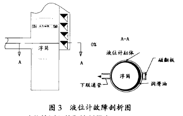 持續(xù)向空貯罐加油至液位計指示值37%時,用時約15min。反之,排油液位計回零用時大于40min。在其它區(qū)域液位變化則快許多。通過對氯酸液位計結構分析,我們發(fā)現(xiàn):圓柱體浮筒(~58mm×280mm)浮在0% ~37%區(qū)間時,形同一個柱塞擋住了液位計簡體下部的聯(lián)通管管口(見圖3,