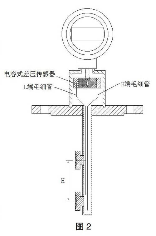 我們?cè)O(shè)想用差壓原理,將差壓高壓端(H端)做出充油的毛細(xì)管和受壓膜盒,毛細(xì)管加膜盒長度為從帶壓容器上的連接器到容器底部;差壓變送器低壓端(L端)也做一個(gè)膜盒,膜片直徑同高壓端的膜盒。這個(gè)膜盒置于上端的容器內(nèi),連接器下,也可以置于連接上邊的封閉腔室內(nèi),封閉腔室與連接器(法蘭)上有差壓傳感器低壓端引壓孔,與被測(cè)容器相連。用以自動(dòng)減去容器內(nèi)壓力。為了使差壓變送器高低端由于真空下充灌硅油等導(dǎo)壓介質(zhì)對(duì)差壓造成的誤差盡可以少,將低壓端的毛細(xì)管做成與高壓端等長,毛細(xì)管下端封閉。這樣,雙向毛細(xì)管所產(chǎn)生的壓力幾乎相等,產(chǎn)生差壓幾乎為零。這樣設(shè)計(jì)還有另外一個(gè)重要功能,就是,無論充填什么樣的導(dǎo)壓介質(zhì),都要產(chǎn)生膨脹與收縮,只要有溫度變化,這種變化就有,由于雙向等長等容,兩個(gè)膜盒幾乎處于同一溫場(chǎng),這種溫度變化產(chǎn)生的影響可以自動(dòng)抵消,由充填導(dǎo)壓介質(zhì)產(chǎn)生的誤差很小。
