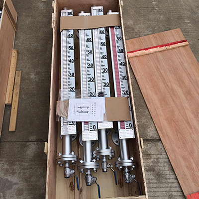 磁翻板液位計(jì)主體外的翻板箱受主體內(nèi)浮子(具有定向磁性源,按不同介質(zhì)和壓力針對(duì)研制)的作用促其翻板翻動(dòng)并顯示紅白顏色,并隨浮子的移動(dòng)指示不同的液面高度。在指示器左側(cè)配有醒目的刻度標(biāo)尺,從而使液位的指示顯得更加清晰。