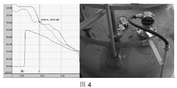 圖3為安裝在濃硫酸槽(高度1.2m)上的雷達(dá)液位計(jì)的回波包絡(luò)線圖。由于液位計(jì)距離罐壁太近而且儲槽本身較小,導(dǎo)致液位計(jì)報警:E641失波。