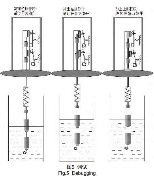 3)在調(diào)試過(guò)程中,發(fā)現(xiàn)液位開(kāi)關(guān)沒(méi)有自保持功能,當(dāng)高報(bào)警點(diǎn)過(guò)后,液位再往上升則高液位報(bào)警會(huì)消除,低液位時(shí)也是同樣,在分析原因后發(fā)現(xiàn),鐵芯在套筒內(nèi)移動(dòng)的位置不當(dāng)是造成不能自保持的原因,如圖5所示,于是在套筒內(nèi)的鐵芯上方加一阻擋塊,使高液位超出時(shí),鐵芯被阻擋塊擋住,不再向上移動(dòng),從而不會(huì)脫出微動(dòng)開(kāi)關(guān)的磁力范圍,對(duì)低液位報(bào)警的自保持是在鐵芯的下部加一個(gè)環(huán)型的墊片,阻止鐵芯向下移動(dòng)超出微動(dòng)開(kāi)關(guān)的磁力范圍。從而提高了可靠性和重復(fù)性。接下來(lái)的調(diào)試中,又出現(xiàn)了一些零零碎碎的問(wèn)題,如磁鐵磁性不夠,或者彈簧彈性不夠,彈簧的抗疲勞性差。元器件的材料和加工工藝不理想,出于對(duì)核電的安全性和穩(wěn)定性的考慮,開(kāi)始考慮使用國(guó)外公司的產(chǎn)品,在試用后沒(méi)有出現(xiàn)以上的問(wèn)題,于是決定從新采購(gòu)一批國(guó)外的液位開(kāi)關(guān),將有問(wèn)題的液位開(kāi)關(guān)更換成國(guó)外的產(chǎn)品。