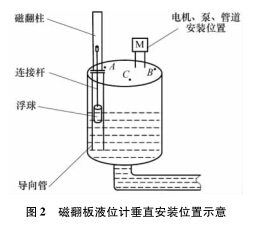 圖 2 中, B 點(diǎn)靠近電機(jī)和泵, 蒸餾水液位計(jì)安裝在此處既影響電機(jī)及泵的檢修, 又因泵附近液位的環(huán)流波動(dòng)較大, 對(duì)浮子導(dǎo)向管沖刷嚴(yán)重, 故 B 點(diǎn)不合理; C 點(diǎn)處因有管道通過(guò), 不便維護(hù)且影響管道和泵、 電機(jī)等的起吊更換, 故也不能選擇 C 點(diǎn); A 點(diǎn)遠(yuǎn)離泵和電機(jī), 且有足夠的空間安裝翻板, 便于維護(hù),所以 A 點(diǎn)較為合適。