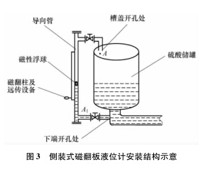 側(cè)面安裝方式的關(guān)鍵點(diǎn)在于: ①酸槽內(nèi)壁襯有瓷磚, 故引流管上開(kāi)孔應(yīng)選擇槽蓋合適位置, 下孔*好在進(jìn)口管上, 且均需加閥門, 便于維護(hù); ②考慮管內(nèi)硫酸在*端天氣時(shí)對(duì)磁翻柱及測(cè)量裝置的影響,因本公司循環(huán)槽溫度在75 ℃左右, 為避免夏天溫度過(guò)高影響傳感器測(cè)量, 冬天防凍, 管徑 D 應(yīng)在 80mm 以上可保證正常測(cè)量。