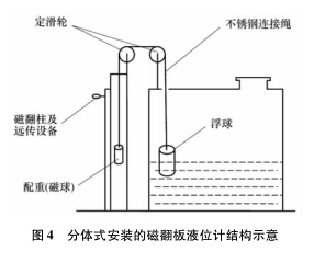 分體式蒸餾水液位計(jì)的安裝步驟如下: ①通過(guò)計(jì)算浮力和配重, 在槽體頂部合適位置安裝定滑輪, 在槽外合適位子安裝磁翻板傳感裝置; ②用直徑為 3 mm 的不銹鋼繩連接浮子和配重, 鋼繩長(zhǎng)度根據(jù)液位來(lái)計(jì)算。這里特別要注意, 磁翻板要反向安裝。