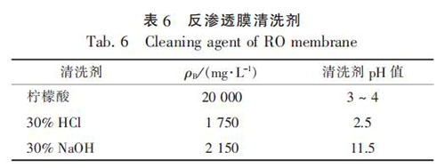 反滲透膜運(yùn)行一定時間后, 污染物會在膜表面沉積, 需要定期進(jìn)行化學(xué)清洗以完全恢復(fù)膜性能。 本系統(tǒng)設(shè)計清洗周期為 3 個月, 清洗包括循環(huán)、 浸泡、 沖洗 3 個過程, 將清洗劑引入反滲透膜 組 , 按 每 支 膜 11.4 L / min 的 流 量 循 環(huán) 5 ~ 15min, 再將單支膜流量調(diào)至 22.8 L / min 循環(huán) 5 ~ 15min, 然后再將單支膜流量調(diào)至 35 L / min 循環(huán) 30 ~60 min, 隨后進(jìn)入浸泡階段, 1 ~ 2 h 后進(jìn)行沖洗,直至濃水電導(dǎo)率與進(jìn)水電導(dǎo)率相同。 反滲透膜采用先酸洗后堿洗的步驟進(jìn)行, 酸洗和堿洗均經(jīng)過上述過程, 酸洗劑可選用檸檬酸或 HCl, 堿洗劑選用 NaOH。 清洗劑選擇見表 6。