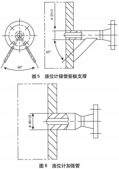 圖5是泄漏襯四氟磁翻板液位計接管結(jié)構(gòu),雖然必25mmx35mm接管的開孔補強滿足GB150-1989標準[11“開孔不另行補強”的要求,但卻不符合現(xiàn)行標準GB/T150-2011的“開孔不另行補強”要求。因為,兩標準雖然限制的設計壓力(<2.5MPa)與接管外徑(<89mm)等條件相同,但是后者改版標準卻對接管壁厚及腐蝕裕量增加了要求,這是合理的改進完善。對于本例的425mm接管,滿足GB/T150-2011的“開孔不另行補強”條件的管壁厚度至少應為5.5mm(按標準規(guī)定當腐蝕裕量為1mm時,接管厚度應不小于3.5mm)。所以,按HG/T20583-2011對小接管避免彎曲而推薦的加強結(jié)構(gòu)優(yōu)先選用加強管形式建議將液位計接管更改為圖6的加強管結(jié)構(gòu)。這樣不但解決了小接管的開孔補強和防彎曲加強問題,也可以使小接管的設計使用年限與罐體一致,而且便于保證小接管與罐體采用插人式全焊透角焊縫的焊接質(zhì)量。