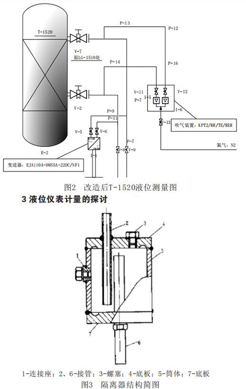 以溶劑吸收工段吸收塔T-1520為例,將該塔處的就地電遠(yuǎn)傳磁翻板液位計(jì)改為反吹法測(cè)量液位,并且至中控室,使得T-1520原有的電遠(yuǎn)傳磁翻板液位計(jì)LT-1510多一道對(duì)比和參考,對(duì)生產(chǎn)工藝的操作更有參考價(jià)值。