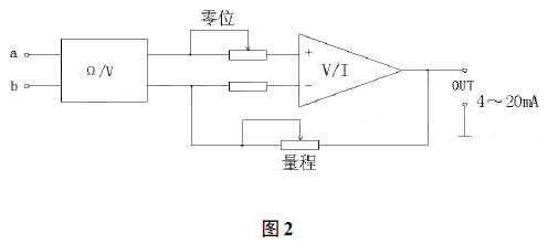 來自液位傳感器的對應(yīng)液位高度的電阻信號,進入圖2所示的a,b端,經(jīng)處理后*終輸出4~20mA DC標(biāo)準信號。