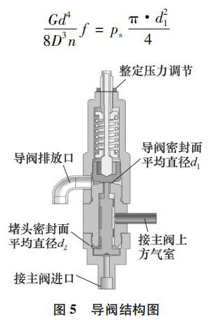 忽略重力和摩擦力因素的影響,對導(dǎo)閥的動(dòng)作過程進(jìn)行受力分析,導(dǎo)閥結(jié)構(gòu)如圖 5 所示。當(dāng)系統(tǒng)壓力升高達(dá)到整定壓力時(shí),氣體在導(dǎo)閥密封面處克服導(dǎo)閥彈簧預(yù)緊力向上頂起導(dǎo)閥的閥芯,此時(shí)應(yīng)滿足: