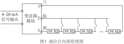 為尋求更好的改進(jìn)方案,對高溫導(dǎo)熱油液位計的測量原理進(jìn)行了深入研究。液位計測量桿中是由等間距排布的干簧管和電阻元件組成,當(dāng)磁浮子達(dá)到某一高度時,對應(yīng)的干簧管閉合,如果能識別出哪個干簧管閉合,即可獲得當(dāng)前液位值。那么變送器又是如何識別出哪個干簧管閉合的呢?再次探究測量桿內(nèi)部電路,繪制液位計內(nèi)部原理圖,如圖3所示。測量桿內(nèi)部電阻串聯(lián)連接,每兩個電阻的連接處連接干簧管的一端,干簧管的另一端并聯(lián)連接,*終引出蘭、棕、黑三根信號線。