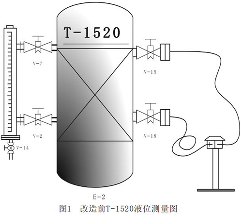 原T-1520液位測量為下圖1所示,左側(cè)為醋酸液位計(jì),右側(cè)為雙法蘭磁性浮子液位計(jì)。