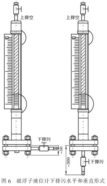 以常用防腐磁翻柱液位計為例。 此類液位計安裝時,一般選用側(cè)-側(cè)連接方式,帶放空和排污。因此, 應(yīng)根據(jù)預(yù)留空間, 決定放空或排污采用垂直(常用)或水平的安裝形式,如圖 6 所示。