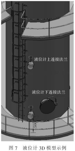 如圖 7 所示,以某項目的 3D 模型為例,防腐磁翻柱液位計下連接法蘭距離平臺 0.5m , 該防腐磁翻柱液位計下法蘭至下排放口(常用垂直形式)約為 0.57m ,為避免平臺開孔,應(yīng)選擇下排污為水平的形式,約為 0.32m。因此,在設(shè)計階段,應(yīng)通過 3D 模型核對每臺液位儀表的安裝位置及空間, 選擇合理的液位計安裝形式,避免施工時儀表安裝不下。