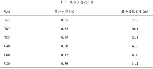 根據(jù)《灌溉渠道系統(tǒng)量水規(guī)范》(GB/T 21303 -2007),設(shè)置標(biāo)準(zhǔn)斷面的渠段長(zhǎng)度,應(yīng)大于 20 倍*大水深。定型斷面量水渠槽的渠段長(zhǎng)度如表 1 所示。