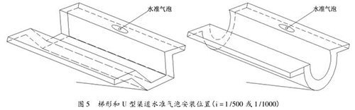 為便于直接確定渠道比降,定型斷面在工廠制作時(shí),在渠道堤頂安裝水準(zhǔn)氣泡,當(dāng)水準(zhǔn)氣泡居中時(shí),設(shè)定的定型渠道斷面比降即為 1/500 或 1/1000時(shí),不需再進(jìn)行渠槽斷面參數(shù)的現(xiàn)場(chǎng)率定,通過量測(cè)定型斷面渠道水深,即可求得過水流量。圖 5 為設(shè)置水準(zhǔn)氣泡的梯形渠道定型斷面和 U 型渠道定型斷面示意圖。