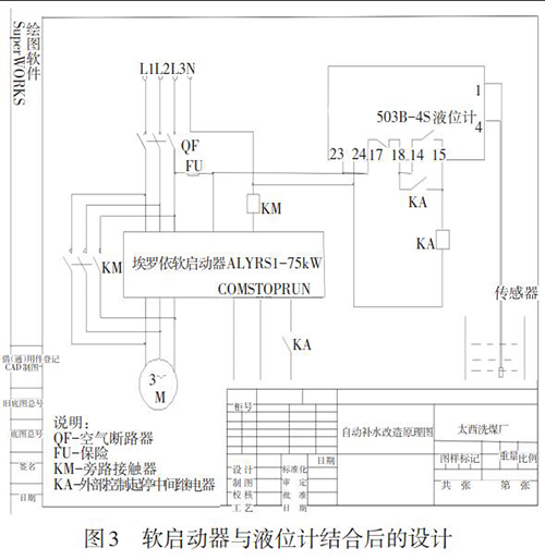 為了降低崗位司機(jī)的勞動(dòng)強(qiáng)度,選煤廠利用水源井原有的埃羅依軟啟動(dòng)器和XMTA-503B-4S液位計(jì),通過(guò)技術(shù)改造,實(shí)現(xiàn)了無(wú)人開(kāi)啟、停止自動(dòng)化和自動(dòng)上水,優(yōu)化了工藝。