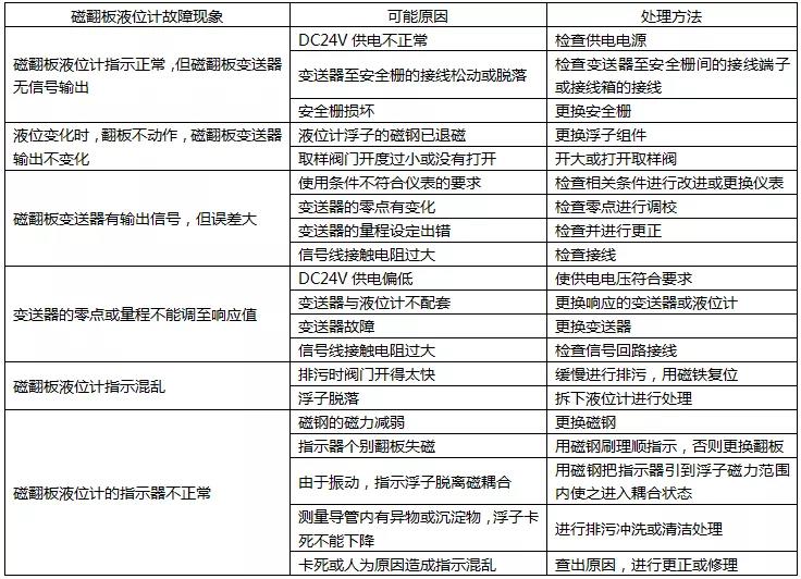 5、側(cè)裝式磁性液位計常見故障的檢查及處理如表1所示