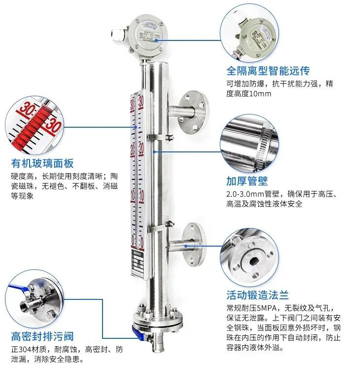 磁性液位計(jì)是根據(jù)連通器和帶磁藕合基本原理而工作中的。做為一種普遍的液位儀檢測(cè)儀表,被普遍用于石油化工設(shè)備、倉(cāng)儲(chǔ)物流運(yùn)送等制造行業(yè)對(duì)各種各樣儲(chǔ)槽、儲(chǔ)罐、球形器皿和加熱爐等機(jī)器設(shè)備內(nèi)的物質(zhì)開展液位儀檢驗(yàn)。相關(guān)磁性液位計(jì)的基本原理,大家都廣為人知,但對(duì)其構(gòu)造和特性卻了解很少。那麼,磁性液位計(jì)的構(gòu)造構(gòu)成和特性有什么呢?
