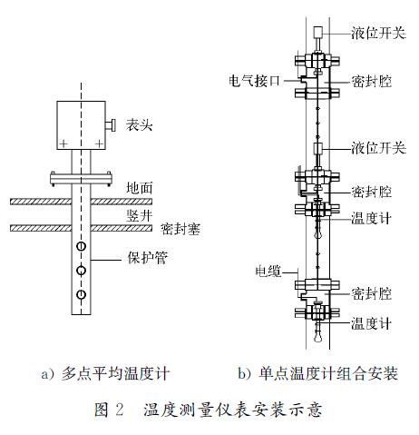 2)2)采用單點溫度計用組合套管安裝的方式,將幾支單點溫度計組合安裝在一根不銹鋼套管內(nèi),測量不同高度油品的溫度。單點溫度計與液位開關合用1根套管,安裝示意如圖2b)所示。