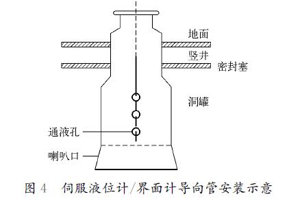 儀表安裝應便于儀表維護、更換及觀測,儀表的觀測面應朝向操作通道,周圍不應有妨礙維修儀表的物件,因而洞罐液位計、界面計和多點平均溫度計的變送單元均安裝在豎井口。考慮到洞罐埋設深度及洞罐儀表檢測元件的長度,為便于儀表安裝,保護洞罐儀表的檢測元件,為伺服液位計、伺服界面計及多點平均溫度計設置了液位計、界面計導向管及溫度計保護管。導向管、保護管安裝時,從上到下的垂直誤差一般小于導向管、保護管口徑的10%,并徹底處理好導向管通液孔的毛刺;焊接必須采用套焊,焊縫必須清理干凈;安裝時,必須保證洞罐儀表與導向管、保護管連接法蘭的水平度,一般控制在1°之內(nèi),伺服液位計、界面計導向管安裝示意如圖4所示。
