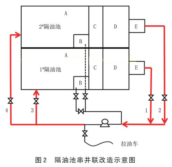 為延長含油污水沉降時間,提高分離效果,對隔油池進行流程改造。如圖 2 所示,A 為沉降池,B為 收 油 池 , C 為 集 水 池 , D 為 排 水 池 , E 為 緩 沖池。增加流程 1 至流程 4,含油污水在 1#隔油池沉降分離后,可通過流程 1、3 重新打入 1#隔油池,也可通過流程 1、4 打入 2#隔油池;含油污水在 2#隔油池沉降分離后,可通過流程 2、3 打入 1#隔油池,也可通過流程 2、4 重新打入 2#隔油池。隔油池流程可串聯(lián)或并聯(lián),實現(xiàn)了互聯(lián)互通。正常情況下,含油污水在 1#隔油池沉降分離后,通過流程 1、4 打入 2#隔油池,實現(xiàn) 2 個隔油池串聯(lián)使用。另外,在隔油池出口管線上連接耐腐蝕軟管,并將其固定在龍門架上,實現(xiàn)流程關(guān)斷,有效防止隔油池低液位卸車時油污直接沖進蒸發(fā)池。在蒸發(fā)池增設(shè)攔油繩,將污油聚集在有限范圍內(nèi),用臨時泵連接軟管將油污打入隔油池。通過以上措施,充分保證隔油效果,進蒸發(fā)池水質(zhì)清澈無油污。