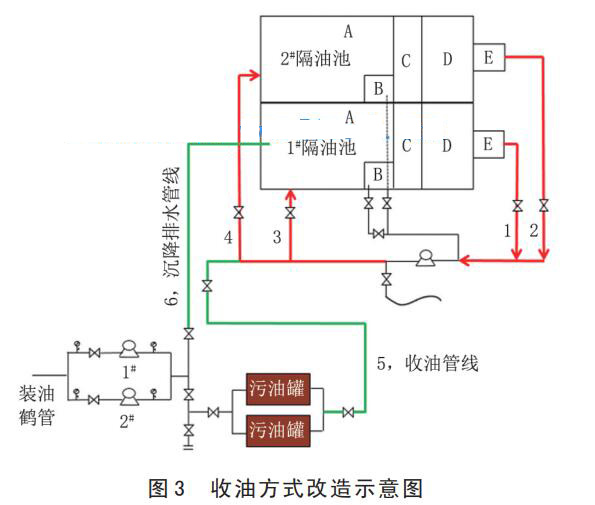 針對拉運頻次高,成本費用高,危廢產(chǎn)量大的問題,將原環(huán)保試驗污水罐改造為污油暫存罐,增設(shè)隔油池收油池至污油罐流程 (圖 3,流程 5),將收集的污油集中在污油罐內(nèi),達到一定液位后,用罐車?yán)\至輪南環(huán)保站。該措施提高了污油儲存容積,大大降低了罐車?yán)\頻次。同時,增加污油暫存罐至隔油池流程 (圖 3,流程 6),罐內(nèi)污油重力沉降后,底部污水壓排至隔油池,降低了污油中混水比例,大大減少了轉(zhuǎn)運危廢的數(shù)量。