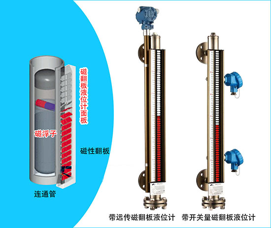 冷凝水液位計主要利用了浮力和磁性偶合來完成指示過程。當(dāng)液位上升時,浮球在浮力作用下由下往上運(yùn)動,翻柱受到浮球中磁感應(yīng)力的作用翻轉(zhuǎn)180°,顏色由白色變?yōu)榧t色,面板上紅白翻柱的分界位置即為罐體中實(shí)際液位高度(如圖1),當(dāng)液位下降時浮球由上往下運(yùn)動,帶動翻柱翻轉(zhuǎn),顏色由紅色變?yōu)榘咨?br />