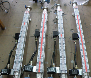 在液位計(jì)立管上由用戶設(shè)定上、下限位置安裝控制器,控制器內(nèi)帶有自保持作用的舌黃開(kāi)關(guān),利用磁性浮子隨液位移動(dòng)使黃片開(kāi)關(guān)動(dòng)作時(shí),實(shí)現(xiàn)報(bào)警或限位控制。