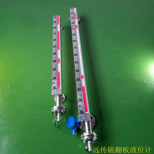 磁翻板液位計(jì)主體外的翻板箱受主體內(nèi)浮子(具有定向磁性源,按不同介質(zhì)和壓力針對研制)的作用促其翻板翻動(dòng)并顯示紅白顏色,并隨浮子的移動(dòng)指示不同的液面高度。在指示器左側(cè)配有醒目的刻度標(biāo)尺,從而使液位的指示顯得更加清晰。